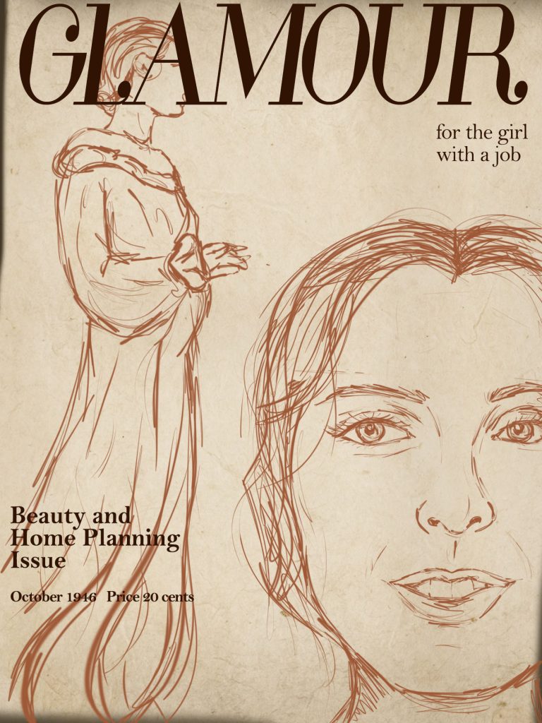 For my redesign of the Glamour magazine cover, I decided to sketch how I would conceptually design the cover using Photoshop. I decided I wanted to keep the cover very similar to the original design, as well as keeping it true to the other magazine covers in this collection. There is a theme throughout the collection where there are two images of the model within one cover, usually with one close up of the models face, and another full body shot of the model, this is to draw attention to what the model is wearing. I started by making a background for the cover, as these are vintage covers, I wanted to make the background look old to replicate that look of traditional paper magazines. To do this I made a blank canvas and using the paint tool, taking a light brown colour, and coloured in the canvas as a base, I then used a free old paper overlay image and pasted it over the background, turning the opacity down so you can see the colours under the overlay, adding a really nice old texture. I then started sketching the model on the cover, I decided I wanted to place the close up of the models face to the right of the magazine, with half of her face out of the shot, i found that this helped free up a lot of space for the full body image of the model, to sketch the model I used the paint tool in Photoshop. I then did the same for the full body image, using that same brown colour to lightly sketch the image, I placed the full body sketch to the left of the cover, adjusting the size so that the length of the sketch takes up the whole length of the cover. I think this placement worked really well, I think it looks consistent with the rest of the collection, and still looked very similar to the original cover. I then started to add the typeface, to get the title font I downloaded a free Glamour font and uploaded it into Photoshop, I wanted to make the font as close to the original font as possible, and I found that the font I added didn’t look quite the same, so I adjusted the characters length to make the font a little bit more elongated. I did the same for the space between the characters, making the spacing a lot closer together which made the font look a lot better. I then used the ‘Bell MT’ font in Photoshop to make the smaller typeface in the cover, I found that this font was very similar to the font in the cover. I used this font for the ‘for the girl with a job’ type, and used the same for the ‘Beauty and home planning issue’ but I found that the typography was quite thin and not very noticeable against the sketch so I made the font bold which helped with this a lot. I did the same with the date and price of the magazine. Overall I think my redesign is conceptually designed in a lot more of an effective way, I think the layout change brings the attention of the audience to the key features in the cover, as well as putting together two images to create emphasis on what the model is wearing.